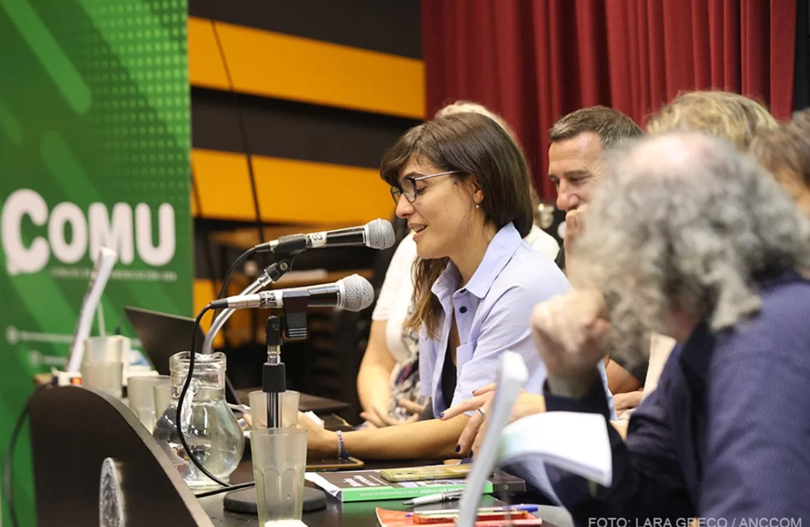 La directora de la carrera de Ciencias de la Comunicación, Larisa Kejval, moderó la mesa de presentación junto a Diego Rosemberg, director de ANCCOM, ante docentes, graduados, estudiantes y familiares que pasaron por la agencia desde su creación en 2015.
