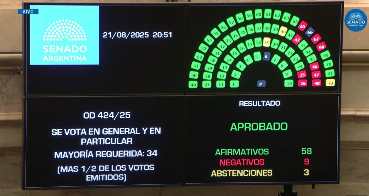 Por amplia mayorÃa, los bloques opositores sumaron 58 votos positivos, contra 9 negativos del oficialismo y tres abstenciones de los senadores MarÃa Huala, Andrea Cristina y el puntano Juan Carlos Romero. La ley pasó al Poder Ejecutivo para su promulgación y Milei tiene diez dÃas para decidir si la veta o no.